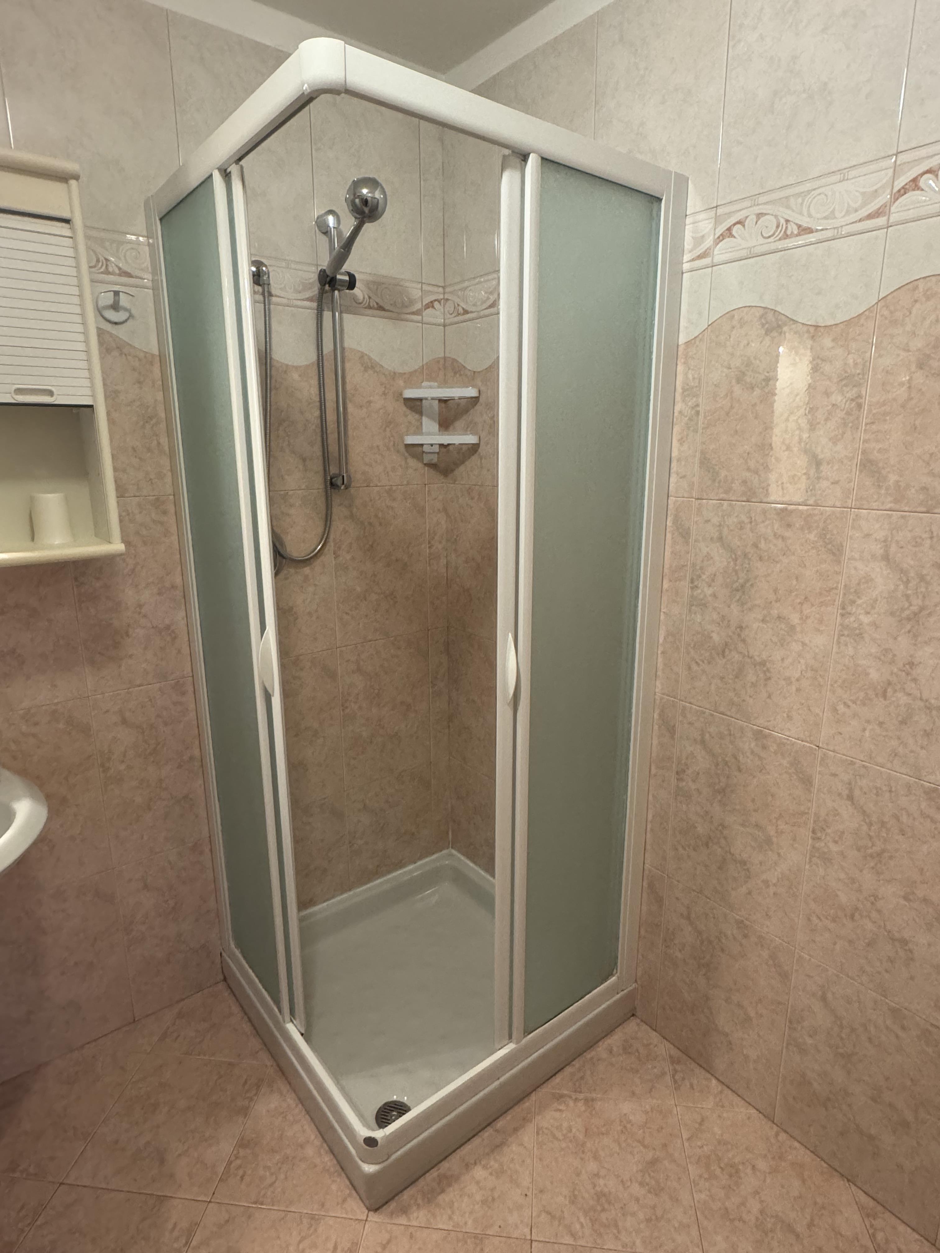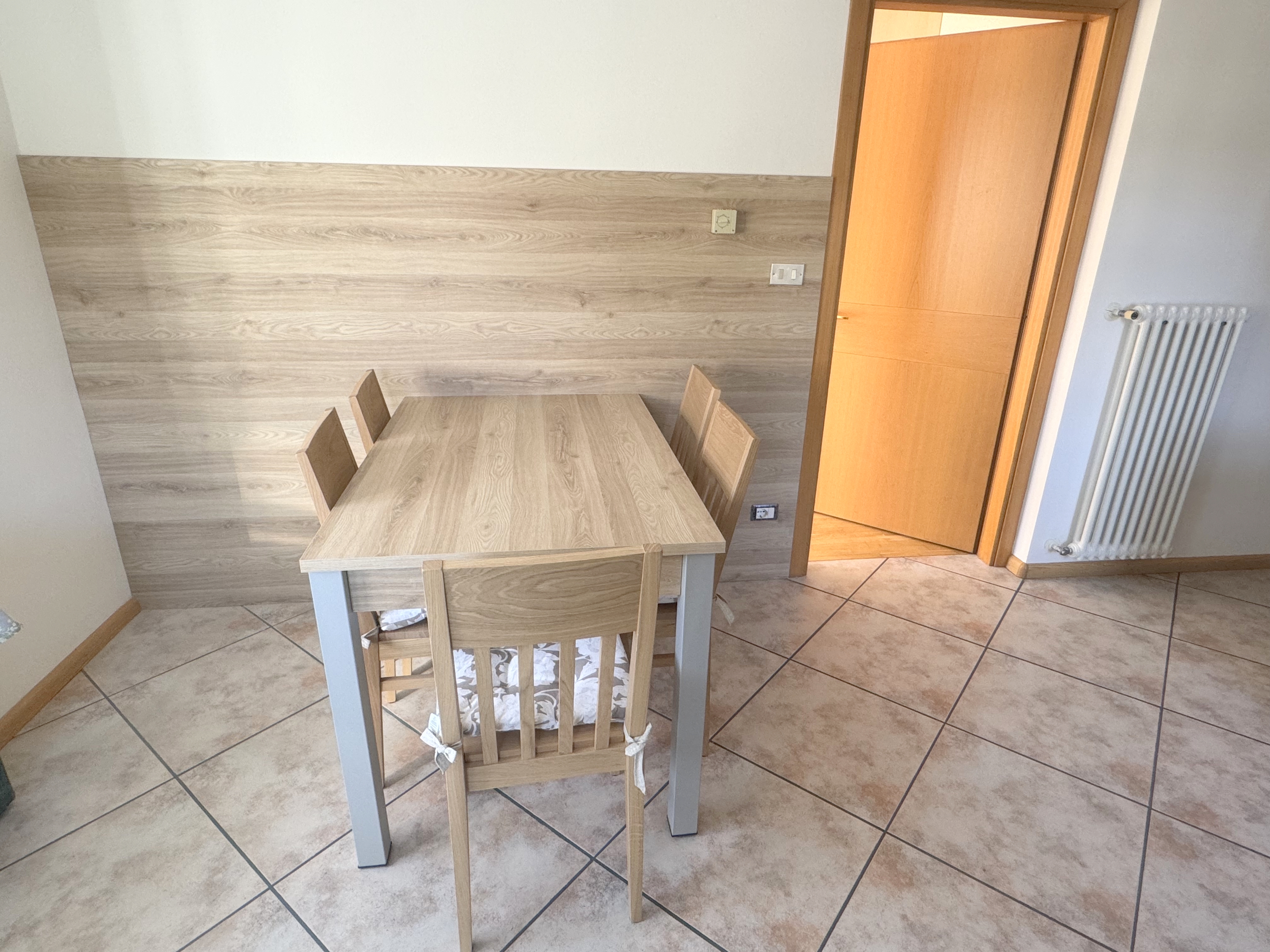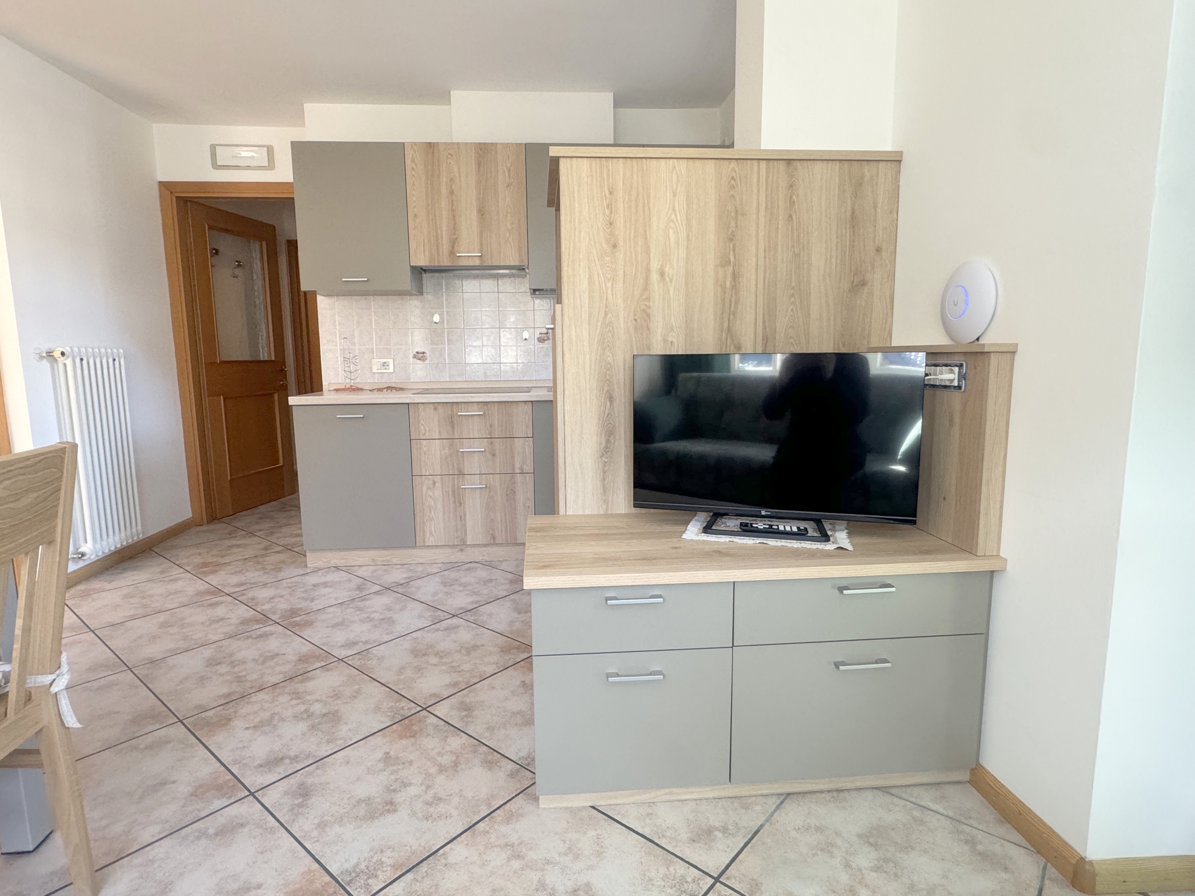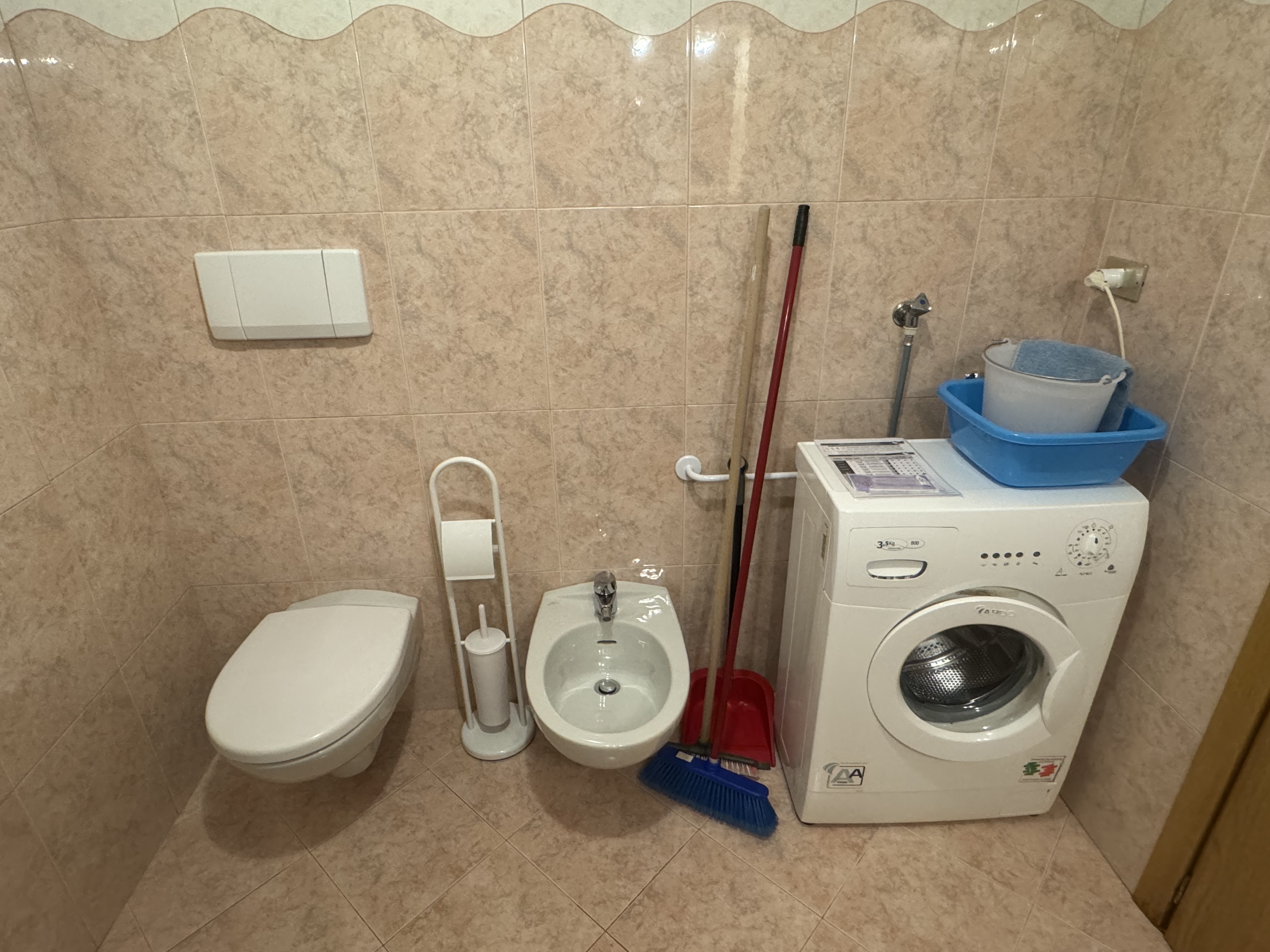 Trilocale al primo piano, composto da una camera matrimoniale, una camera con un letto a castello e un terzo letto singolo, un bagno con doccia, asciugacapelli, lavatrice, accessori per stireria, zona giorno con angolo cottura attrezzato, piastra in vetroceramica, frigorifero (con scomparto freezer), microonde e bollitore, TV schermo piatto, due balconi.
