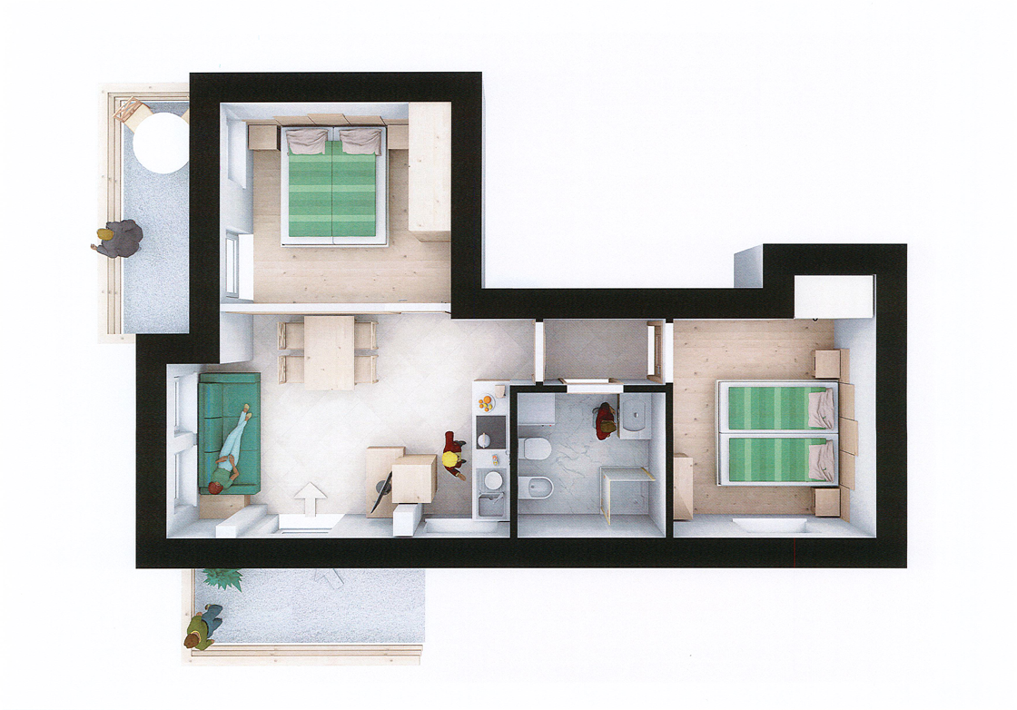 Trilocale al primo piano, composto da una camera matrimoniale, una camera con due letti singoli (che all’occorrenza possono essere uniti e diventare un letto matrimoniale), un bagno con doccia, asciugacapelli, lavatrice, accessori per stireria, zona giorno con divano letto singolo, angolo cottura attrezzato, piastra ad induzione, frigorifero (con scomparto freezer), microonde e bollitore, TV schermo piatto, due balconi.